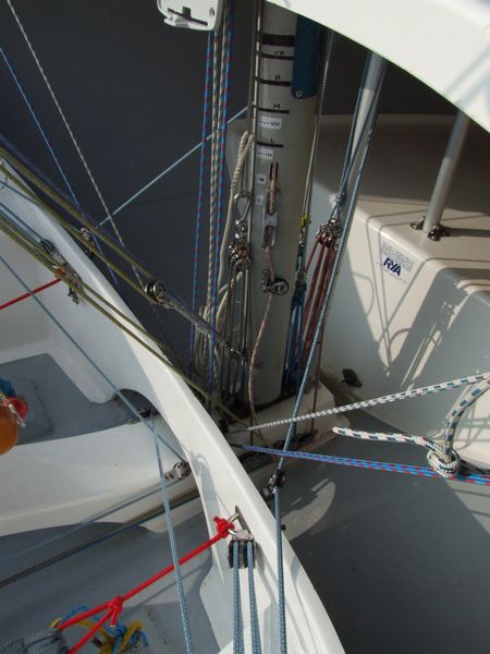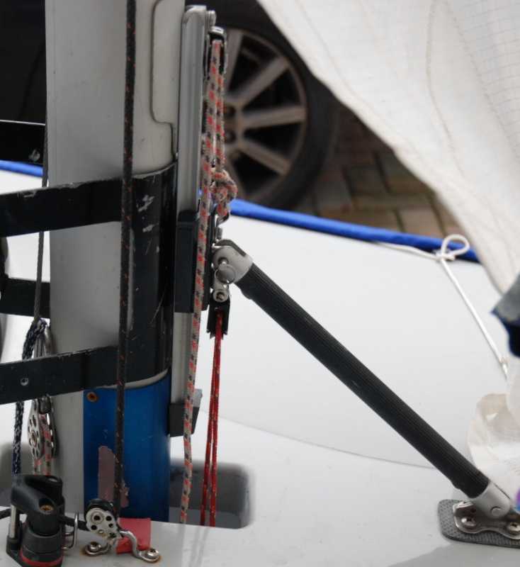 Unfortunately the owner couldn't show me how to rig up, so I was wondering if anyone has photographs they can share of the rope systems. The ones I need most help on are the jib halyard and strut uphaul/downhaul, as I'm fairly happy I've figured the others out. In particular there is what looks like a dyneema strop that comes out of the bottom of the mast that I just cannot figure out. In this photo the large circle shows where the strop comes out and the small circle marks the end of it (to give you an idea of length I think it is about 70cm long).